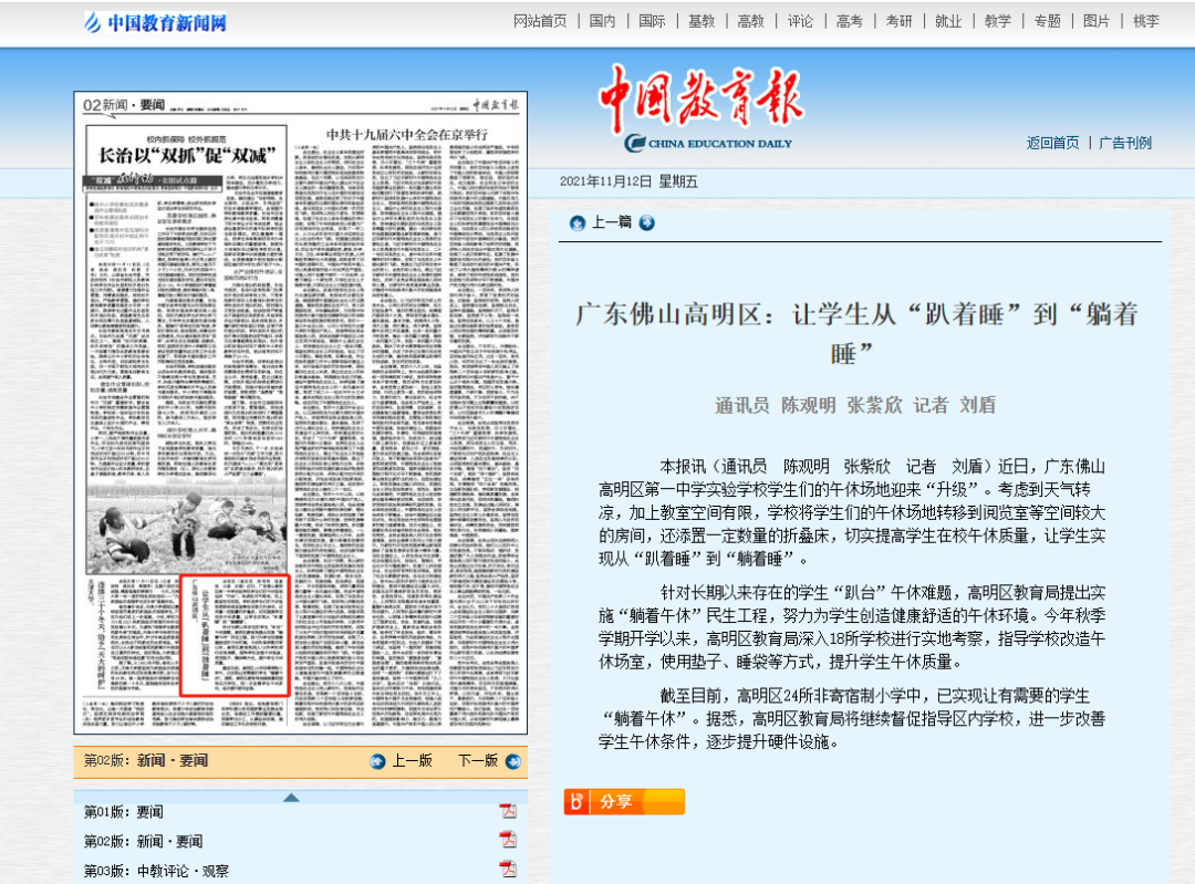 继11月11日中国教育新闻网关注高明区“双减”成效后,2021年11月12日《中国教育报》采编报道高明区“双减”校内午休成果,《广东佛山高明区:让学生从“趴着睡”到“躺着睡”》刊登在主报 02版新闻要闻版,将高明”双减“经验面向全国推广。