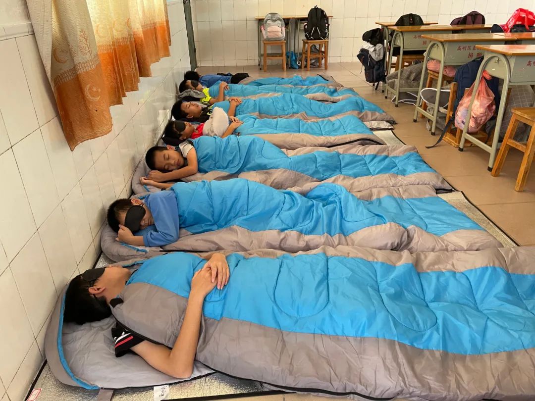 高明区新圩小学同学们在教室使用睡袋躺着行午休。