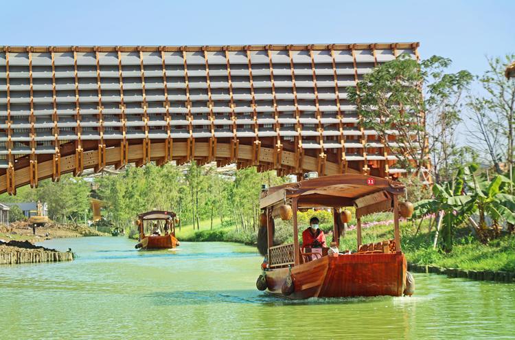 来到古劳水乡,最不可或缺的当属游船之趣。白日里,乘着扁舟,听着小调,在碧波荡漾中游览水乡自然风光,看渔耕农忙场景,沿途亭台楼阁、粤剧表演、咏春小品等水乡风情演艺陆续上演,沉浸式领略“做一天水乡人”的趣味。当夜幕降临,泛舟夜游,则又是另外一番美景:天上繁星点点,桥梁光影斑驳,水景和建筑交相辉映,水上演出你方唱罢我登场,自由闲适来往的游客不知不觉已入画中,让人沉醉其中,任性虚度时光。