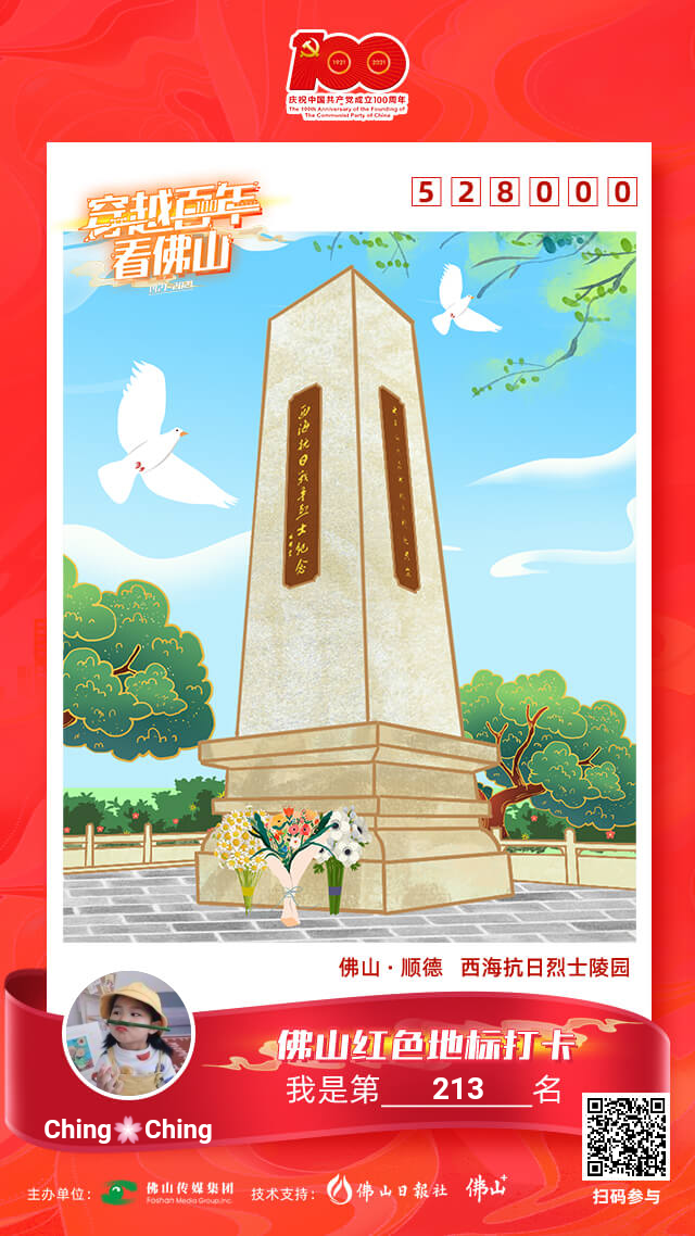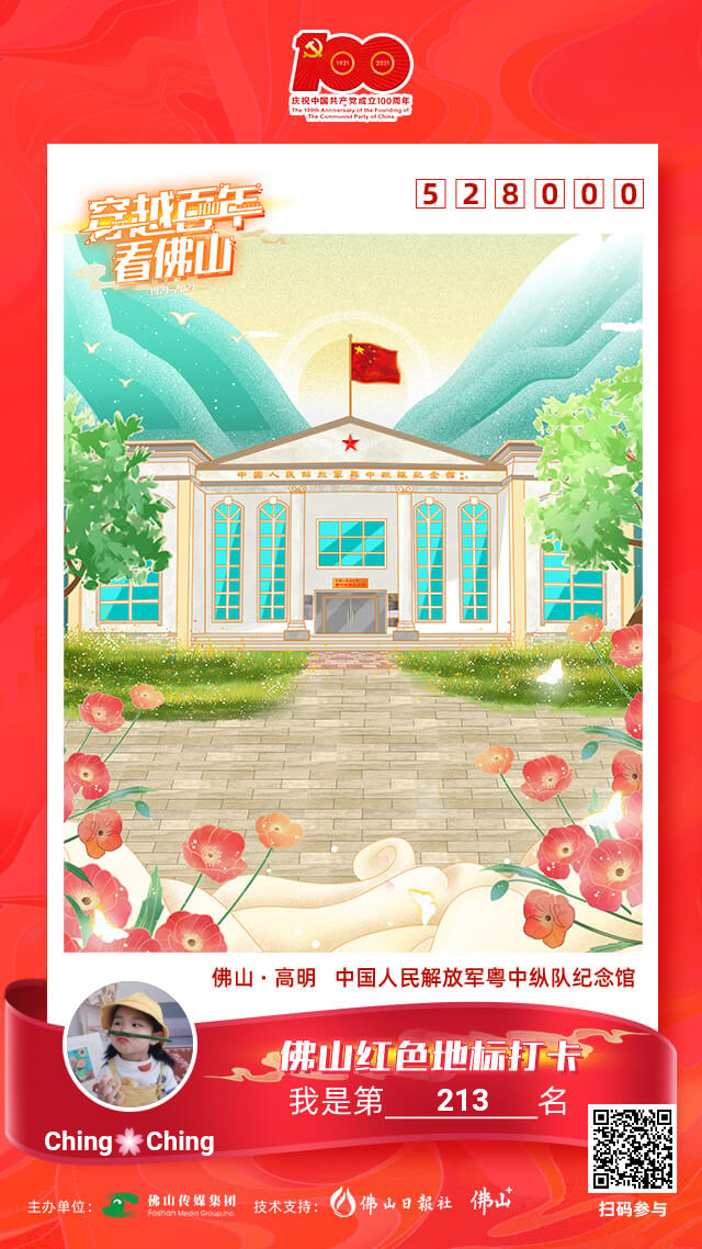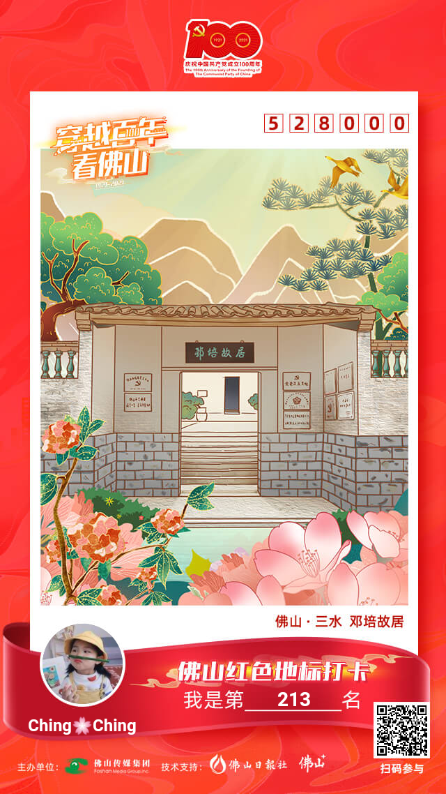 “佛山红色地标打卡,我是第xxx名。”《穿越百年看佛山》1.0版本“红人馆”设计了海报生成环节,市民只需完成任意一区的红色地标打卡,即可根据个人喜好从5张精美手绘海报中定制带有个人头像、姓名、排名的专属“红色名片”,以此唤起市民对“红人馆”中重要场景的回忆。