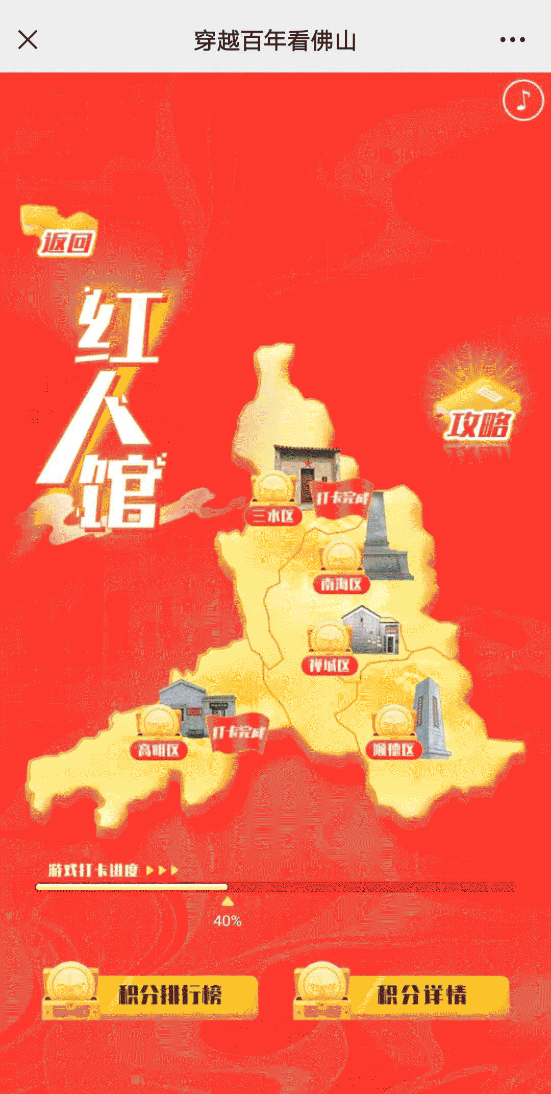 在打卡红色地标后,市民还可以挑战闯关。闯关形式包括党史问答、猜经典革命歌曲,内容涵盖党的百年光辉历程中的重大历史事件、重要理论思想等,以及佛山地方党史知识精选,市民可以一边闯关,一边从党史中汲取智慧和力量。