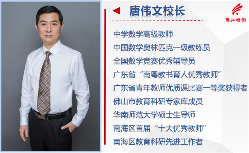学校管理团队来自佛山市南海区名校,秉持与各名校一脉相承的管理模式和管理理念。作为中学数学高级教师,校长唐伟文是中国数学奥林匹克一级教练员、全国数学竞赛优秀辅导员、广东省“南粤教书育人优秀教师”、广东省青年教师优质课比赛一等奖获得者、佛山市教育科研专家库成员、华南师范大学硕士生导师、南海区首届“十大优秀教师”、南海区教育科研先进工作者。